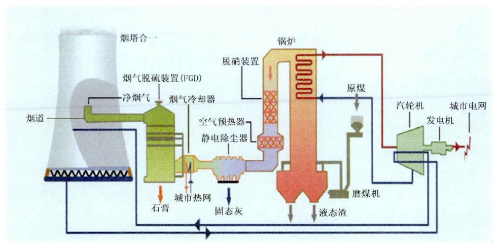 “烟塔合一”技术则是将电厂的烟囱和冷却塔合二为一,取消烟囱,将经过除尘、脱硫和脱硝后的烟气,由自然通风的冷却塔直接排入大气中的技术。