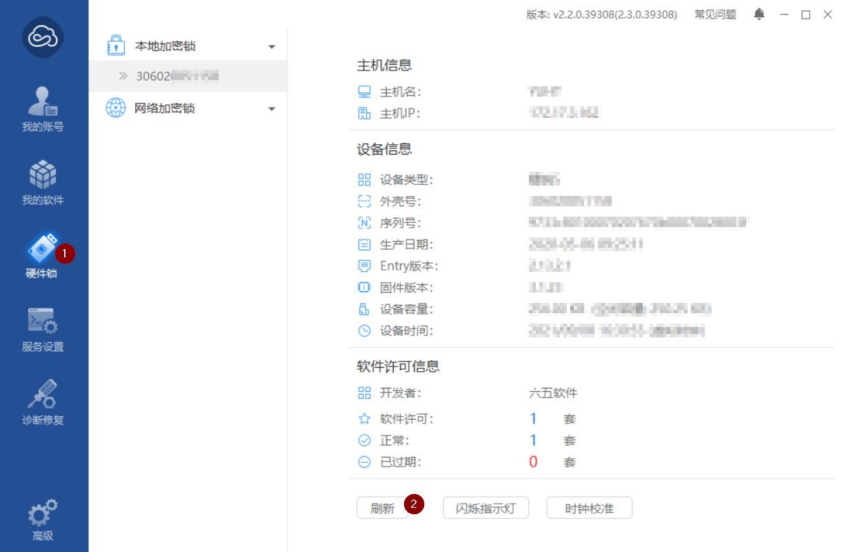 将电脑联网,插上加密锁,打开软锁,选择位置①硬件锁,点击位置②刷新,重新激活加密锁。