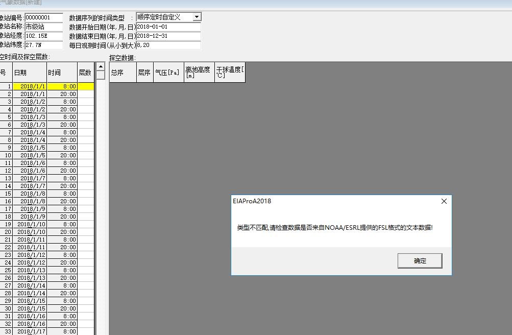 A:导入地面或者高空气象数据时,出现下图的错误提示,原因是数据格式不符合软件要求,软件支持的地面数据格式主要为OQA、A文件,高空数据支持的为FSL、OQA格式,因此需要向数据提供方咨询是否是上述格式。