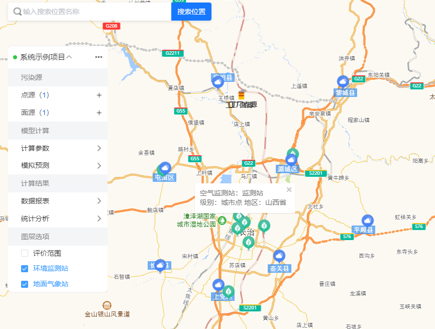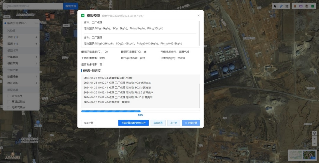环境空气质量在线计算模型以《环境影响评价技术导则 大气环境》(HJ2.2-2018)推荐的AERSCREEN、AERMOD和CALPUFF为基础开发,实现基础数据自动获取,参数自动设置,预测结果与卫星图、行政图、三线一单、自然保护区等图层相叠加,按照大气导则要求自动输出大气专题报告。